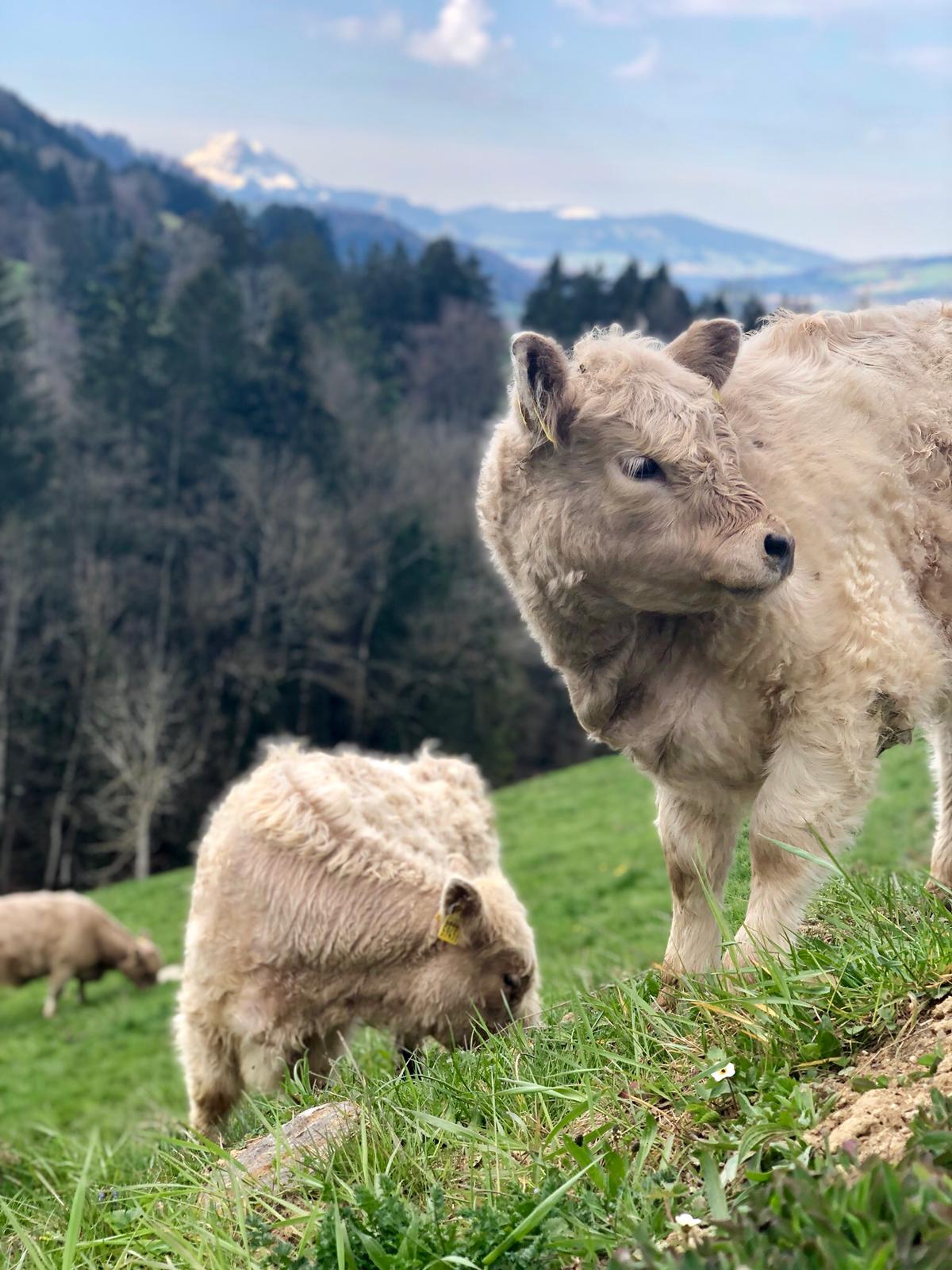 À première vue, nos vaches Galloway ressemblent à des peluches sur pattes : une robe frisée, une allure paisible, une nature douce. Ce sont les anges de nos pâturages, parfaitement adaptées à la vie en plein air, toute l’année, sans cloison, sans concentré, sans artifice.
